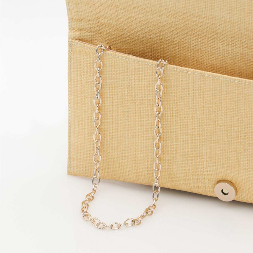 Bolso cartera de mano modelo SIENA de LODI en tejido de rafia color natural. Detalle metálico en color oro con logo de la firma. Asa extraible de hombro en cadena metálica de color oro. Bolsillo interno con cremallera. Interior forrado en tejido. Cierre mediante imán. Alto 13 x Ancho 29 x Fondo 2.
