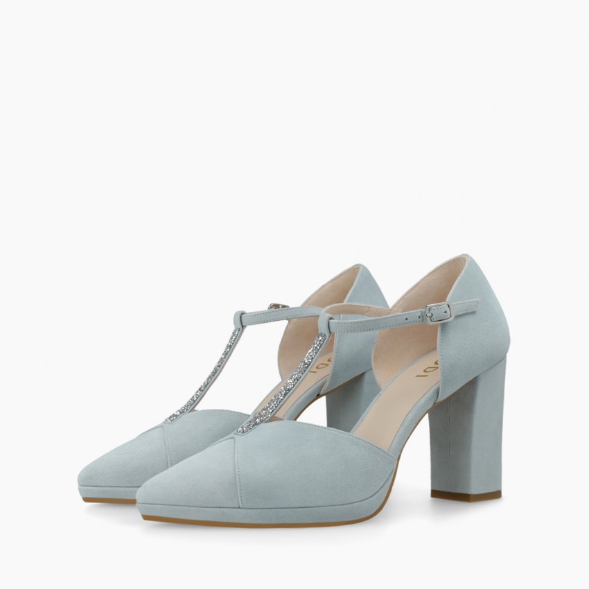 Zapatos de salón de mujer de novia LOCAL de LODI en ante de color azul. Detalle de tira en pedrería efecto cristal en el empeine. Diseño confeccionado con tacón ancho de 9 cm y plataforma de 1 cm de altura. Cierre en lateral mediante hebilla metálica en tira. Escote redondeado y punta fina. Interior forrado en piel. Disfruta de unos de los días más especiales de tu vida con el mayor confort junto a LODI. Incluye planta new gel para mayor comodidad en todas tus pisadas. Fabricado en España.