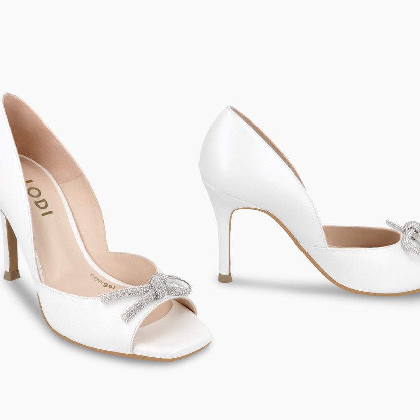 Salones de novia SAMIER de LODI en piel de color blanco. Destaca detalle de lazo de cristal en la punta. Un diseño confeccionado con tacón fino de 9.5 cm de altura. Laterales acabados en pico. Punta descubierta. Interior forrado en piel. Disfruta de uno de los días más especiales de tu vida con la mayor comoidad junto a LODI. Incluye planta new gel. Fabricado en España.