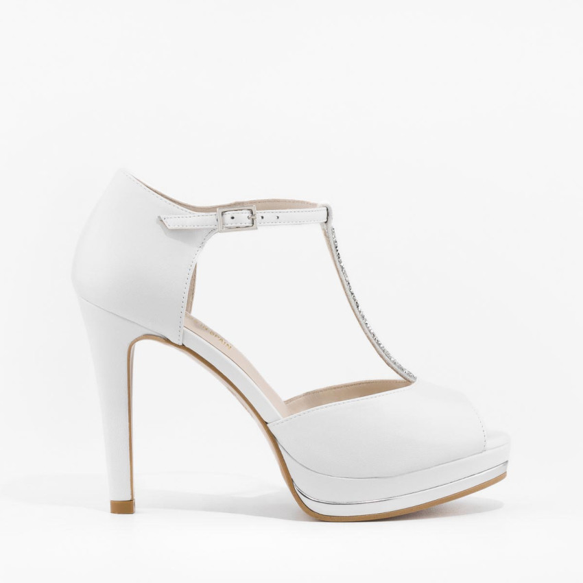Sandalia de novia Pauli color blanco con tira de cristal. El artículo talla más grande de lo habitual, te recomendamos escoger una talla menos.
