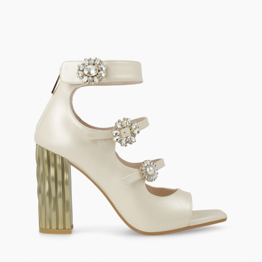 Sandalias de mujer de novia WEBCAM de LODI en piel de color dorado. Detalle de hebillas en varios tamaños con pedrería en forma de flor. Un diseño confeccionado con tacón ancho bañado en color oro de 10 cm de altura. Cierre mediante cremallera trasera. Punta cuadrada.