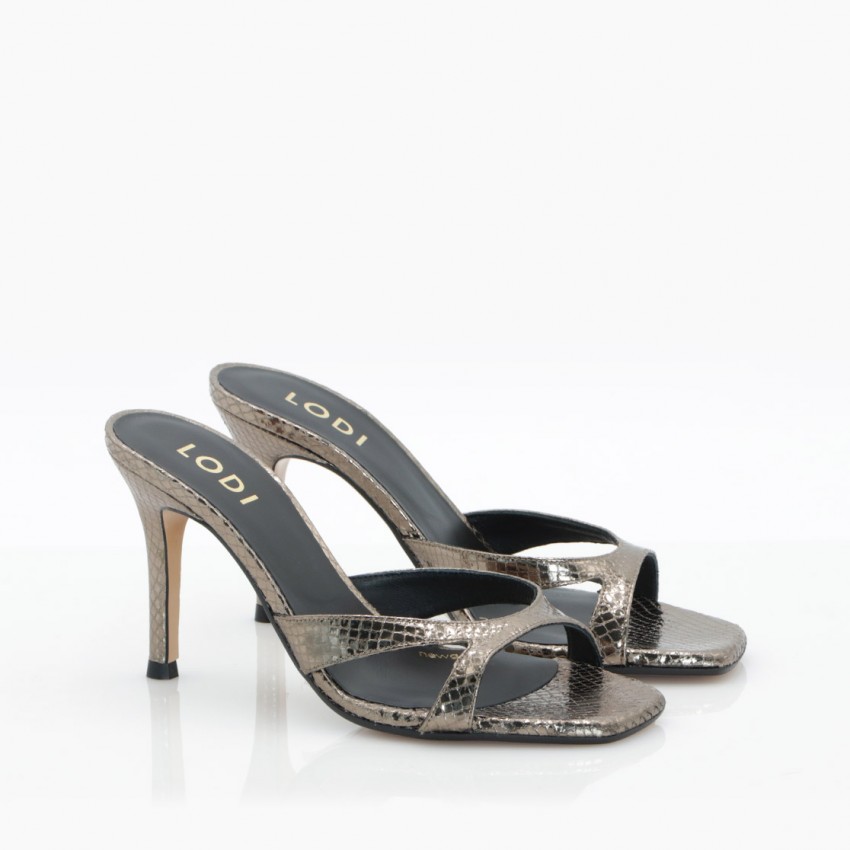 Sandalias de mujer tipo mule SIRAGEL-X de LODI de piel metalizada. Elegante y sencillo diseño que aportará un toque seductor a tus looks. Confeccionado con tacón fino de 9.5 cm de altura. Punta cuadrada. Interior forrado en piel. Incluye planta new gel para mayor comodidad en todas tus pisadas. Fabricado en España.