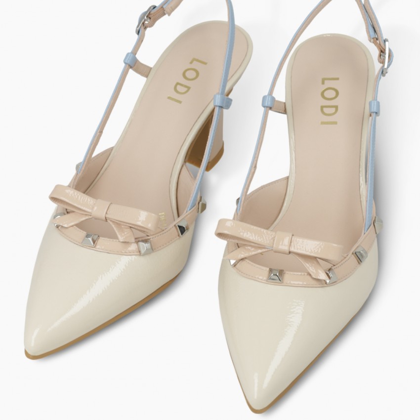 Zapatos de salón de mujer destalonados RAMUSIR de LODI en piel acharolada. Detalle de tachas metálicas y lazo en piel. Confeccionado con tacón geométrico de 7.5 cm de altura. Cierre en tira mediante hebilla metálica en lateral. Punta afilada y escote redondeado. Interior forrado en piel. Incluye planta new gel para mayor comodidad en todas tus pisadas. Fabricado en España