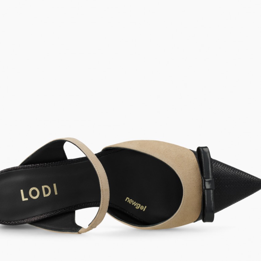 Zapatos de salón destalonados de mujer CHURE de LODI combinado en tejido y ante. Detalle de lazo en piel. Diseño confeccionado con tacón ancho de 5.5 cm de altura. Elástico en lateral interno para mayor ajuste. Punta afilada. Interior forrado en piel. Incluye planta new gel para mayor comodidad en todas tus pisadas. Fabricado en España.