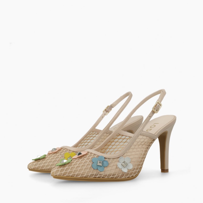 Zapatos de salón de mujer destalonados de mujer con rejilla y flores
